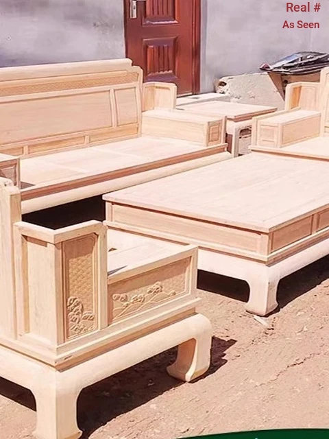 Antique-Style Solid Elm Wood Sofa Set - New Chinese-Style Living Room Furniture with Intricate Carvings - 100% Solid North Elm Wood, Unfinished Sofa for a Timeless Elegance