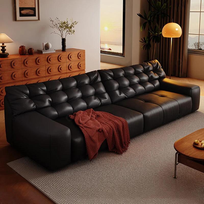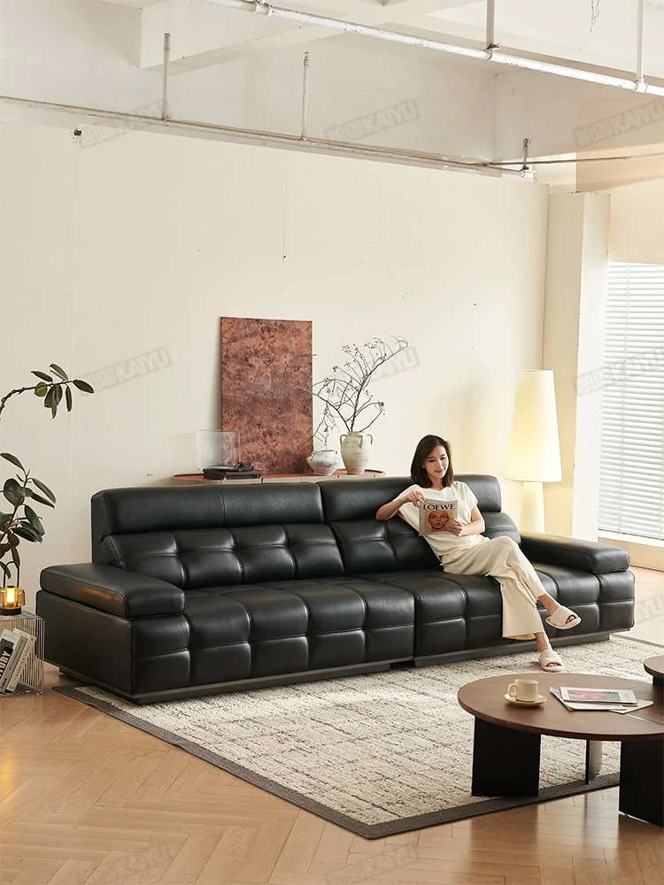 2024 New Italian Minimalist Tofu Block Sofa - Black Napa Leather Modular Design with Vintage Genuine Leather for Living Room, Featuring a Large Black Bear Aesthetic