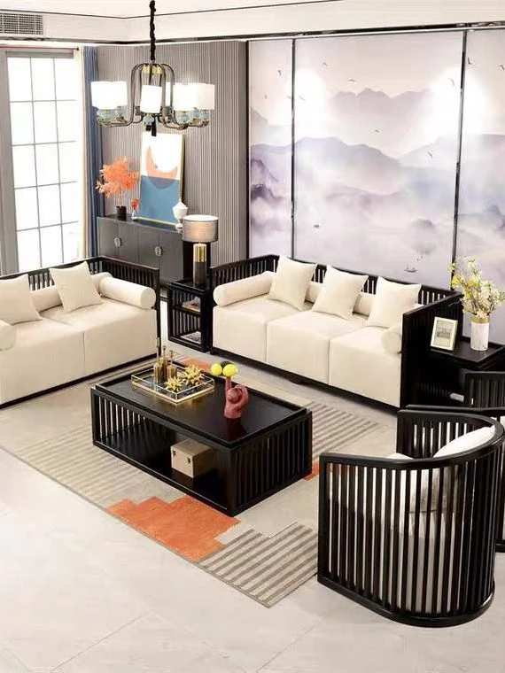 Modern Minimalist Black Sandalwood Sofa Set – Elegant Zen Style for Large Villas and Spacious Living Rooms, Crafted from Solid Wood for Luxury and Comfort.