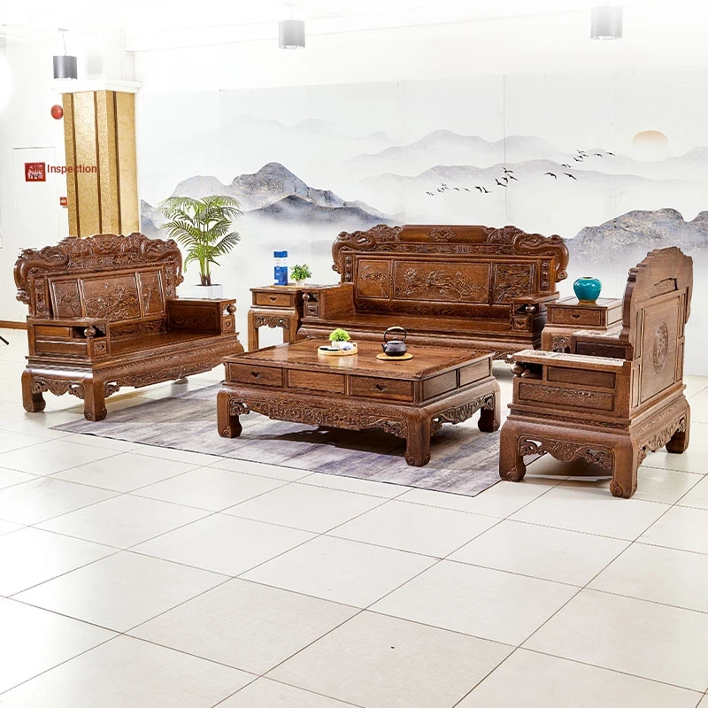 Antique-Style Solid Wood Sofa Set - 123 Model, 4-Piece Combination with Single, Double, and Three-Seat Options (1+2+3) - Classic Carved Design for Elegant Living Rooms - U-Shaped Configuration