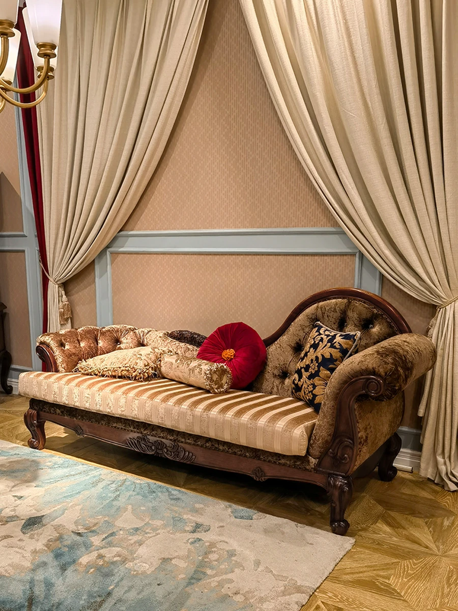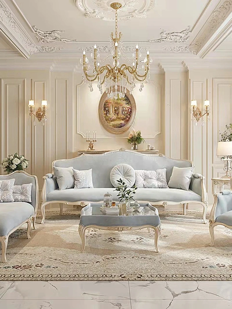 Luxurious French-Style Solid Wood Carved Sofa Set – Elegant European Villa Upholstered Three-Seater and Loveseat Chaise Lounge Furniture Combination