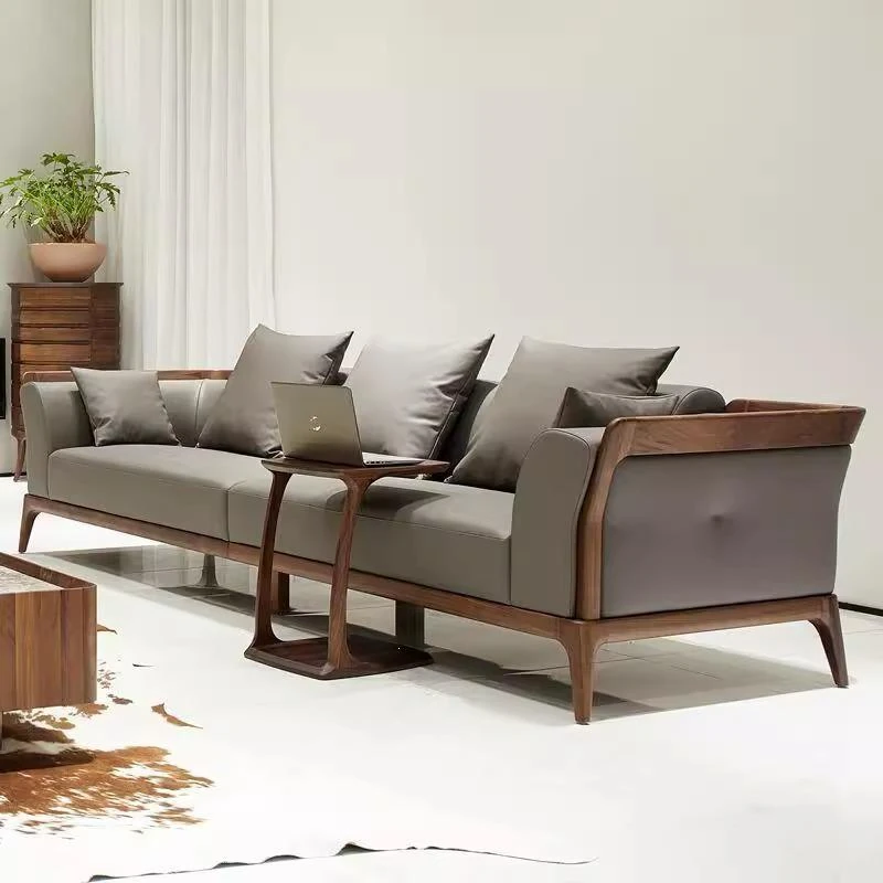 Modern Chinese Walnut Wood Leather Sofa - Stylish 3-Seater for Small Living Rooms, Designed for Comfort and Elegance. Perfect for Contemporary Spaces!