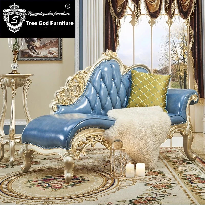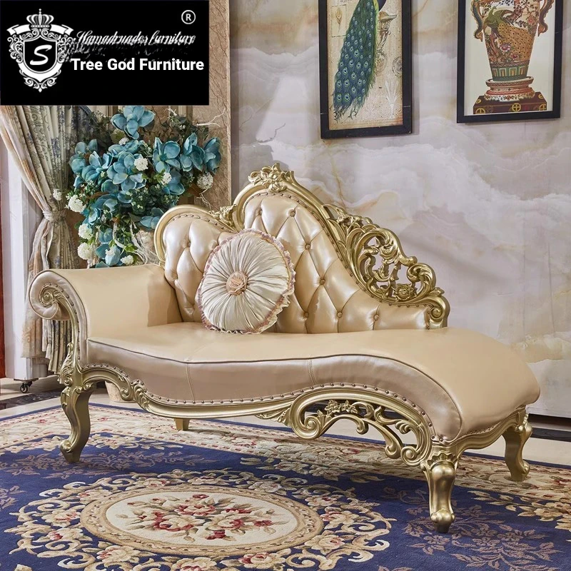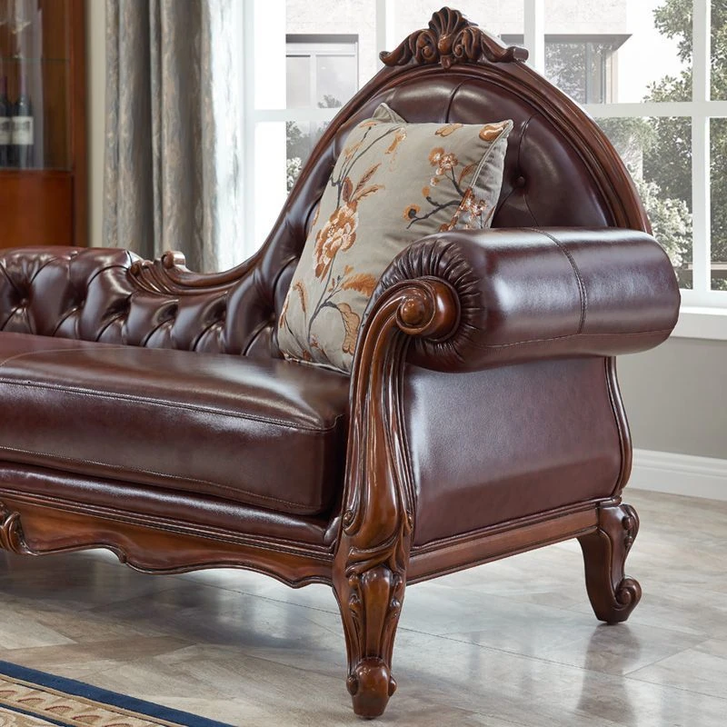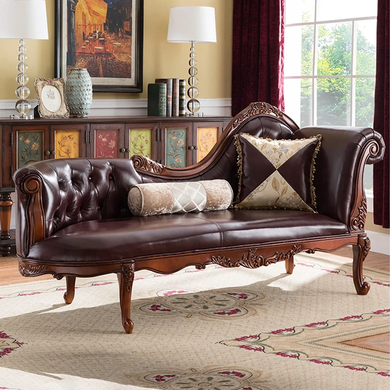 European-style Chaise Lounge - American Living Room Solid Wood Carved Genuine Leather Sofa Chair, Ideal for Bedroom and Small Spaces, Perfect for Relaxation and Comfort
