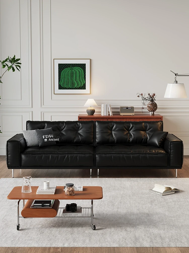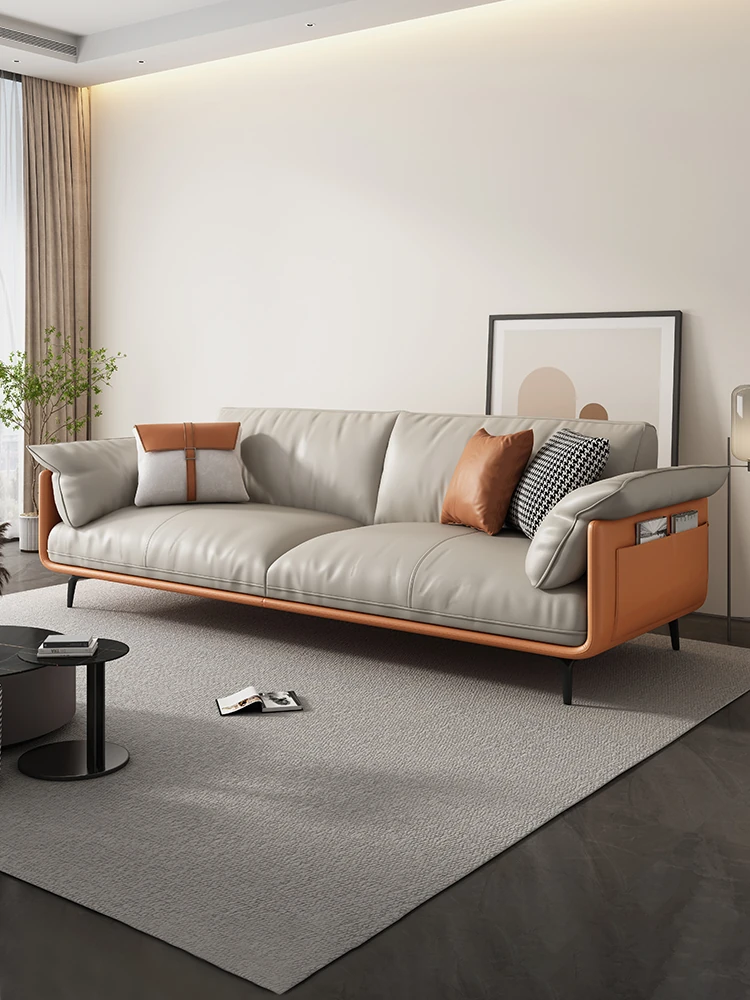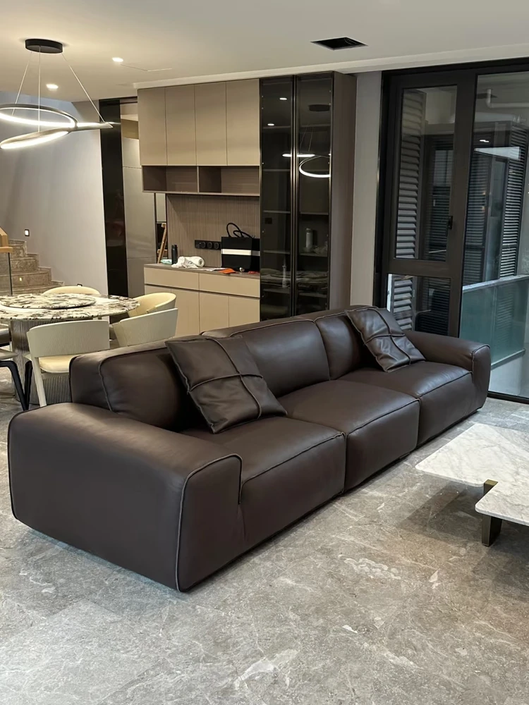 Italian Minimalist Genuine Leather Sofa - Perfect for Any Living Room Size, Made with Napa Cowhide and Featuring Nordic Light Luxury Design, Plush Down-Filled Three-Seater Furniture.