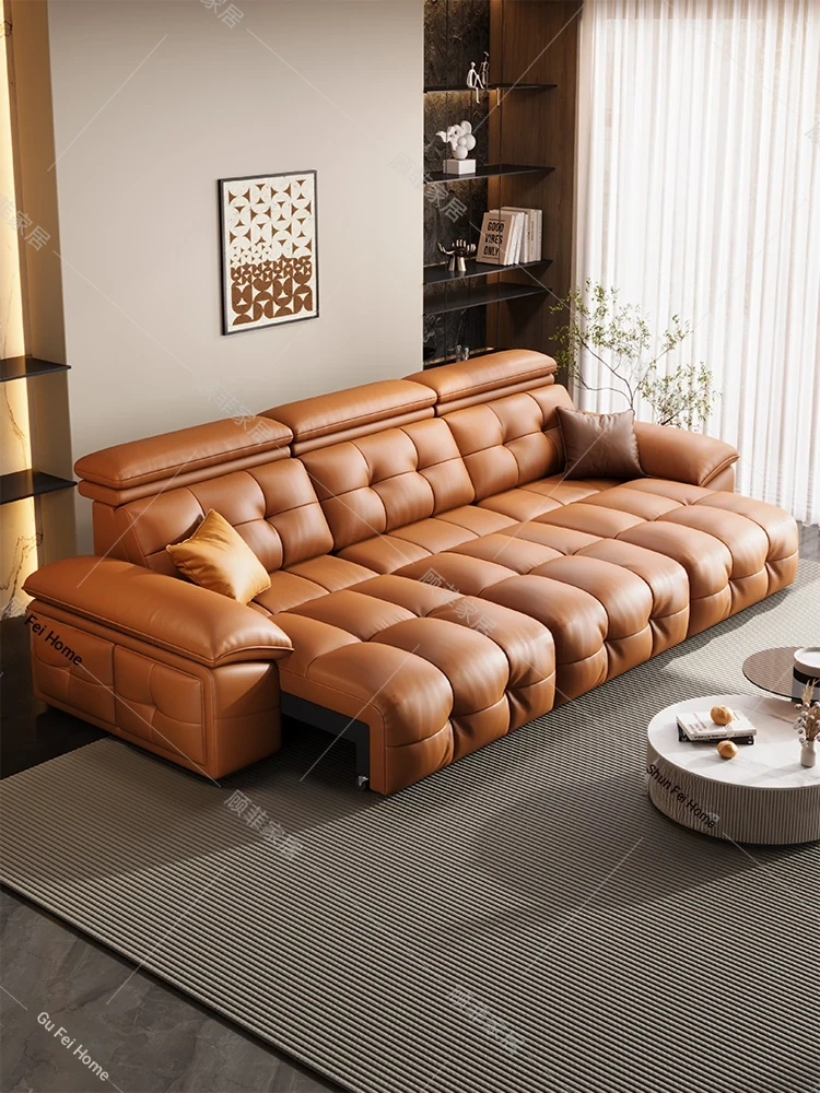 Elegant European-style Sofa Set for Living Room – Convertible Sofa Bed with Chaise Lounge, Perfect for Small Spaces, American Light Luxury Design, Genuine Leather & Solid Wood Construction.