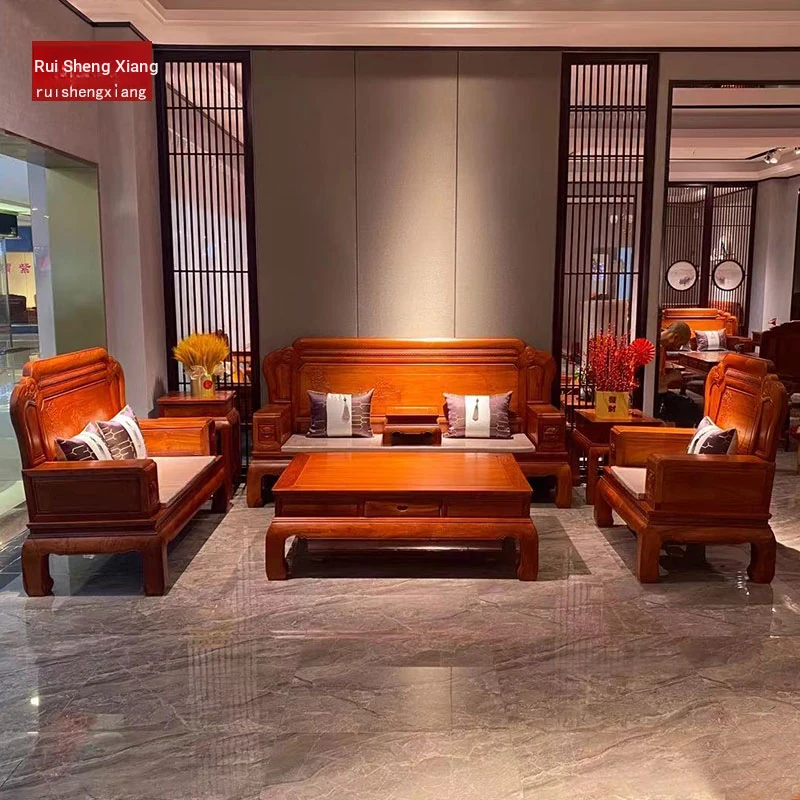 Luxury Solid Wood Sofa Set in New Chinese Style - Versatile for All Seasons, Perfect for Any Size Living Room. Crafted from Purple Sandalwood, This Elegant Classic Furniture Adds a Touch of Sophistication to Your Home.