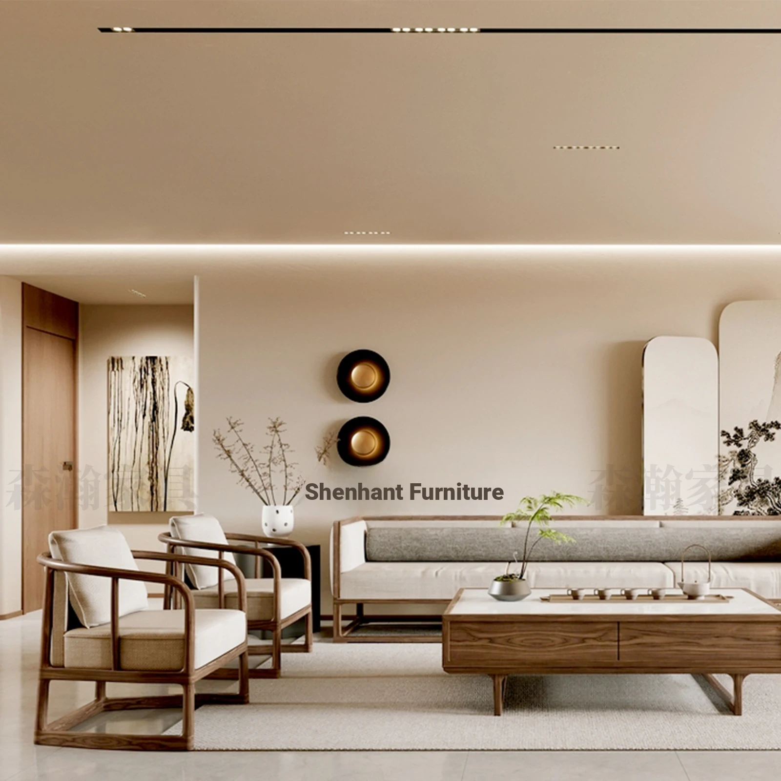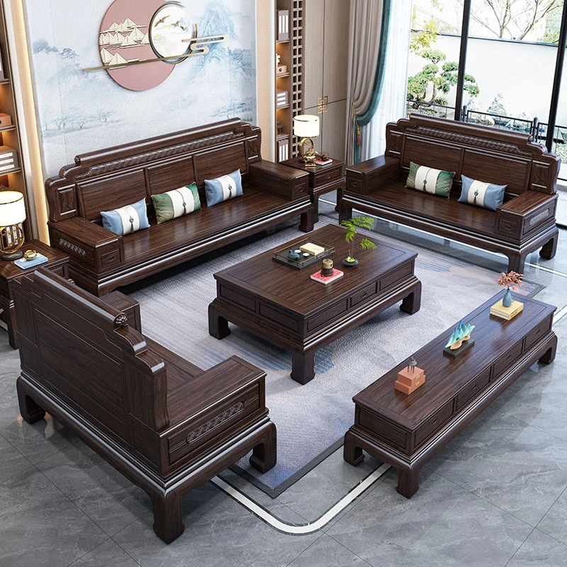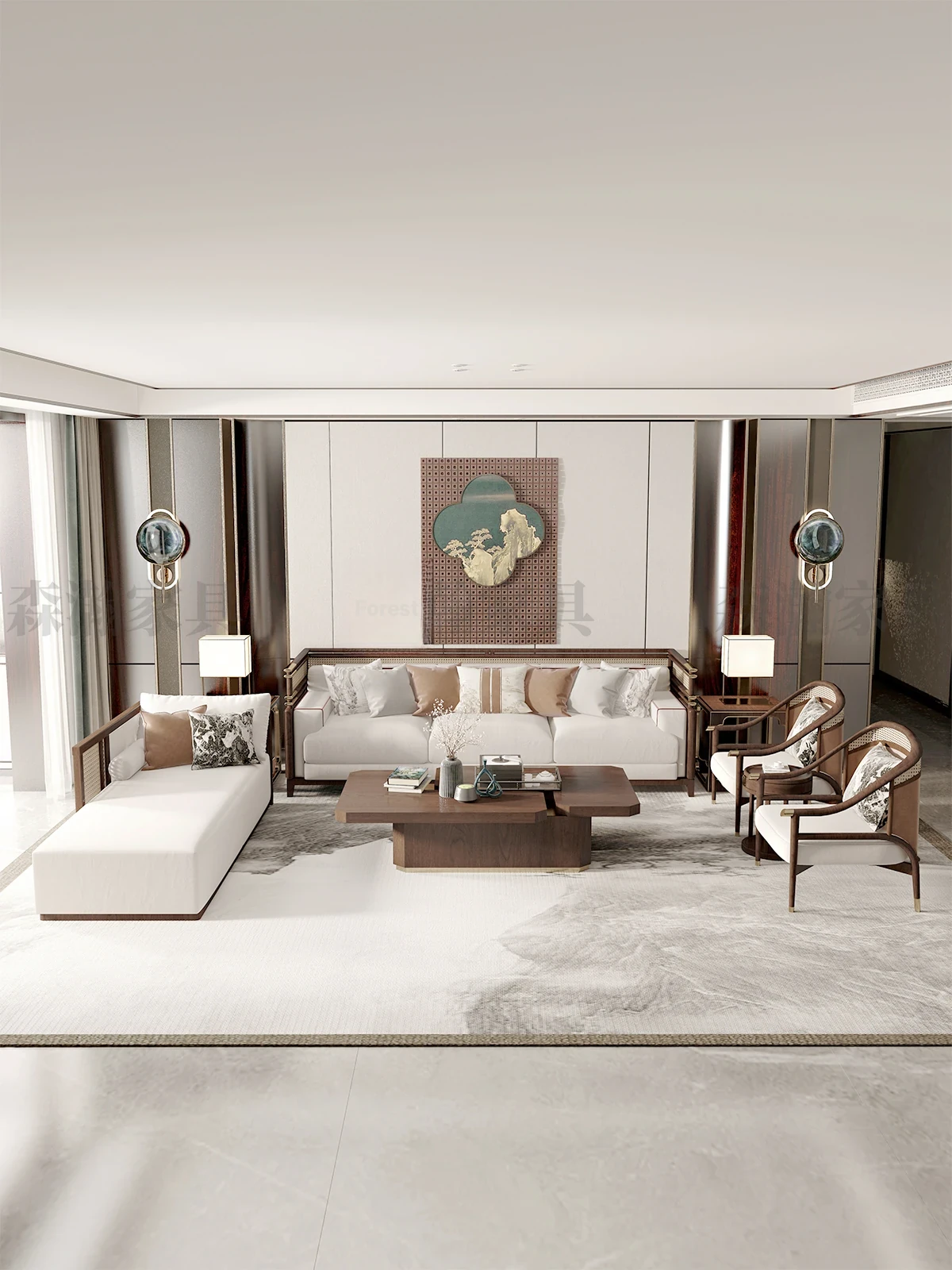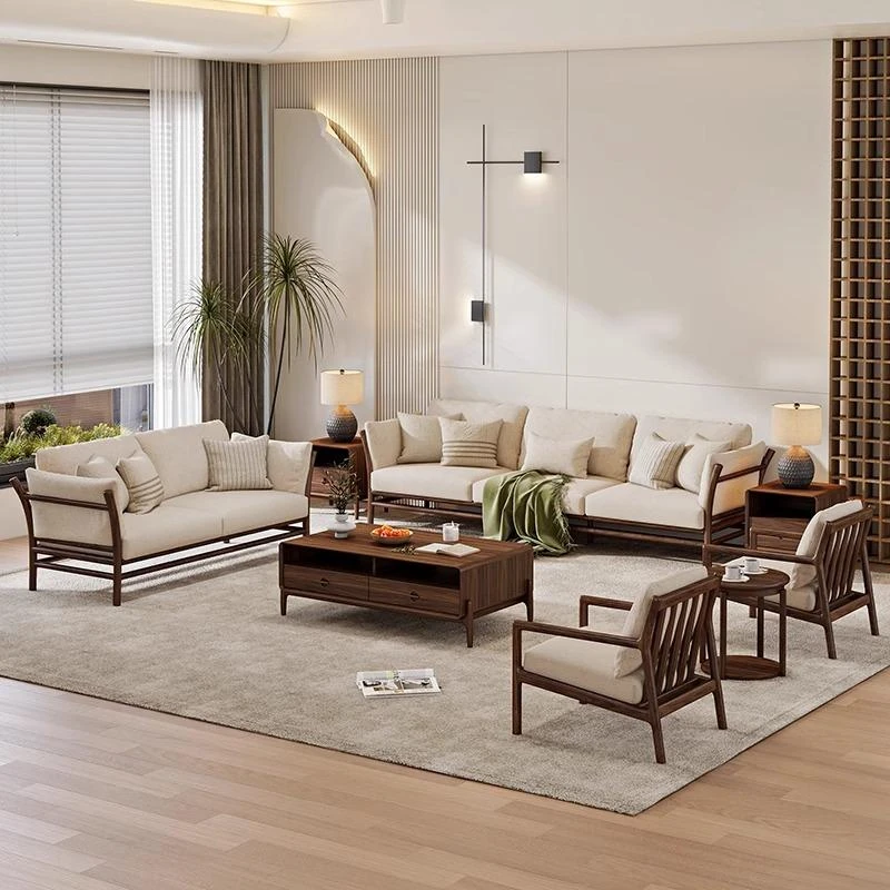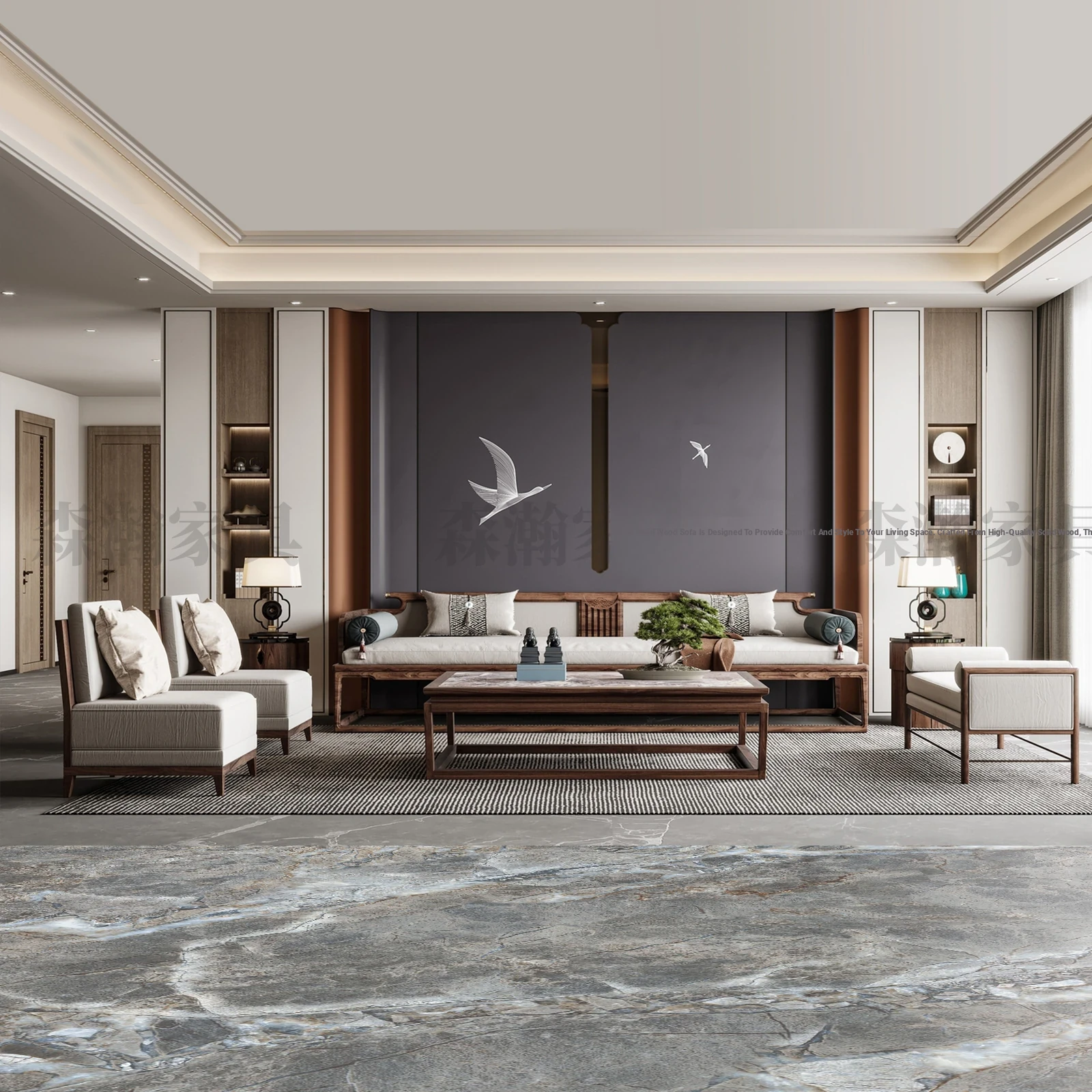 Modern Chinese Solid Wood Sofa Set - Elegant Zen-style Walnut Furniture for Spacious Villas and Living Rooms