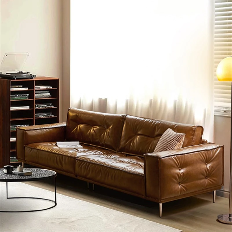 French Genuine Leather Sofa for Small Spaces - Vintage Waxed Leather with Top Layer Cowhide in Caramel Color, Perfect for Cozy Living Rooms