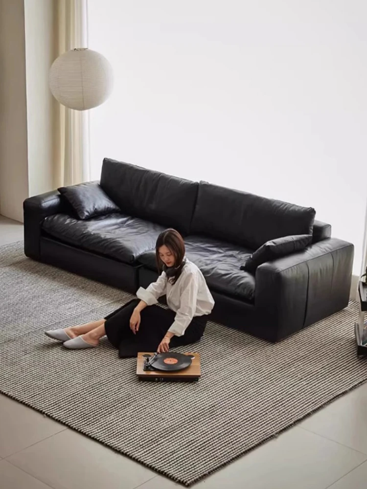 Feguoguo Minimalist Genuine Leather Tofu Block Sofa - Black Luxury Style 3-Seat Combination Sofa for Small Living Rooms
