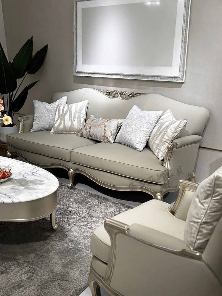 French Elegant Solid Wood Carved Living Room Sofa Set - Luxury American Genuine Leather for Small to Large Spaces, Perfect for High-End Villas and Upscale Interiors.