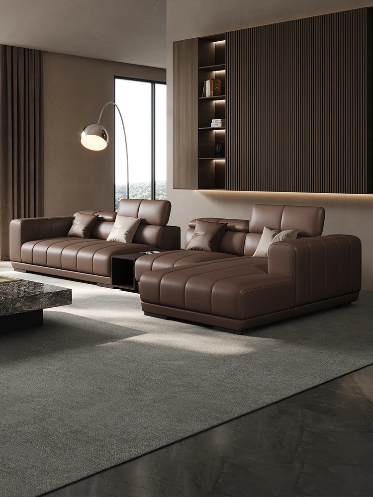 Italian Minimalist Leather Sofa with Piano Key Design - Premium Top-Grain Leather, Modern Corner Sectional for Spacious Living Rooms, Coffee Brown Color