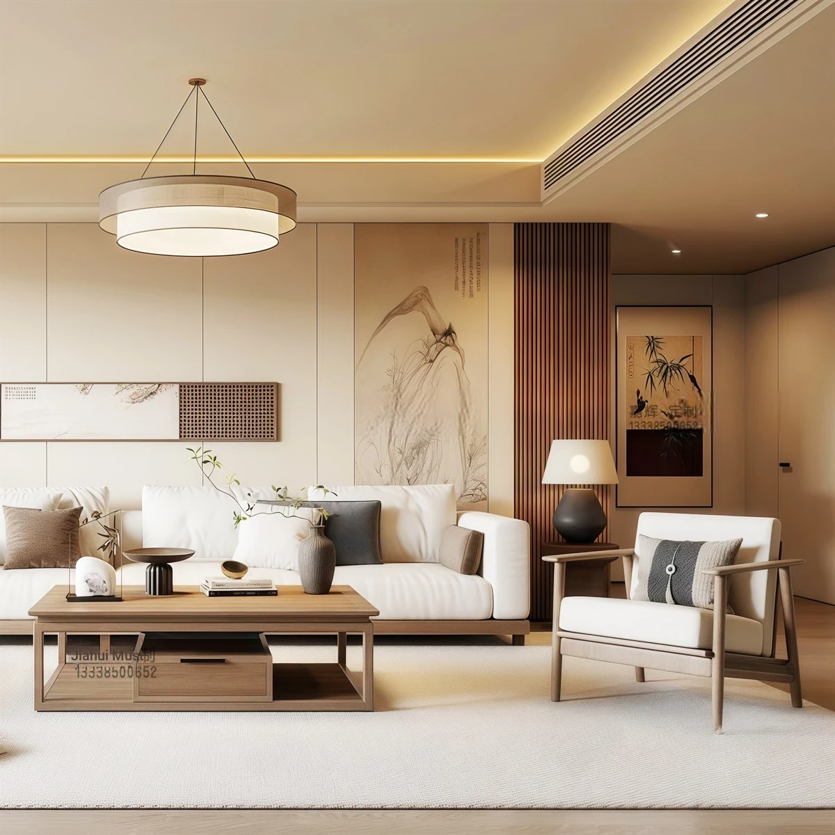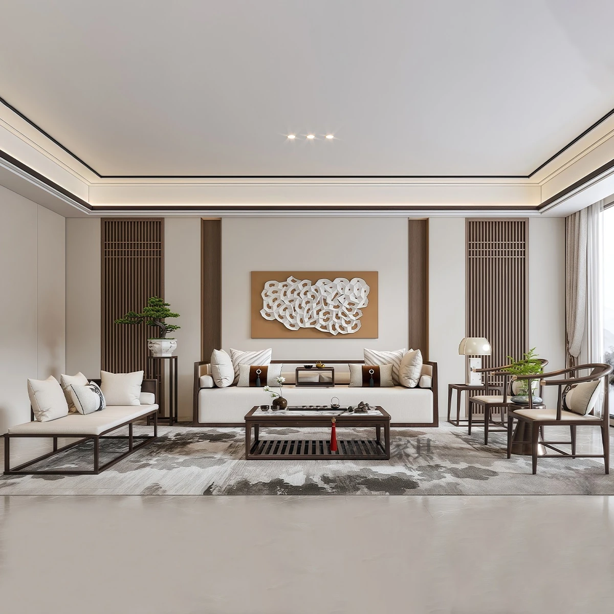 Modern Minimalist Solid Wood Sofa Set - New Chinese Style Fabric Furniture for Villa Living Rooms, Zen-Inspired Design for Sample Homes