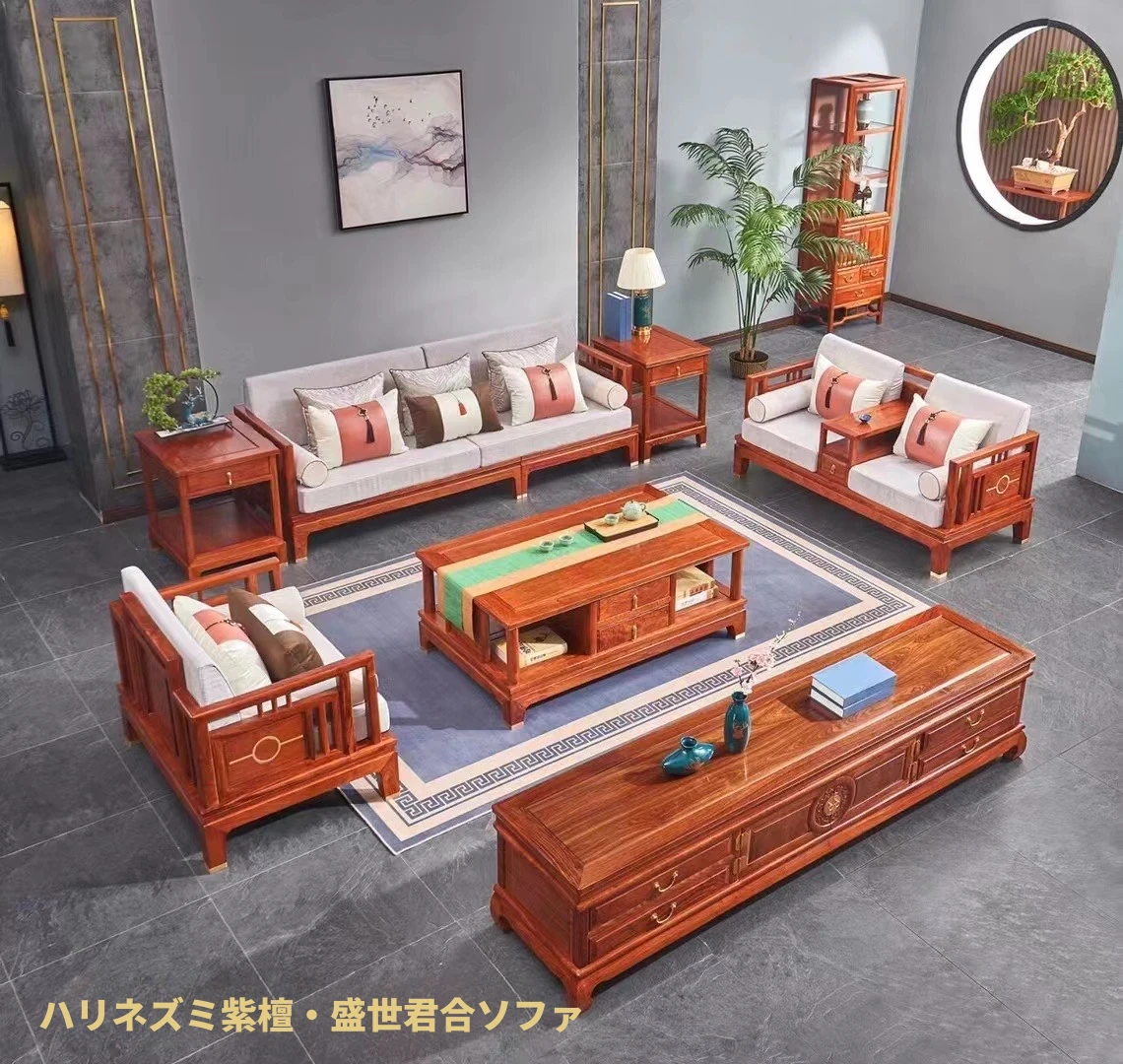 新中式デザインの紅木ソファ - ヒメハリ材使用の高品質実木組み合わせソファ。優雅な花梨木の風合いで、居心地の良いリビング空間を演出します。伝統と現代の融合で、特別なひとときをお楽しみください!