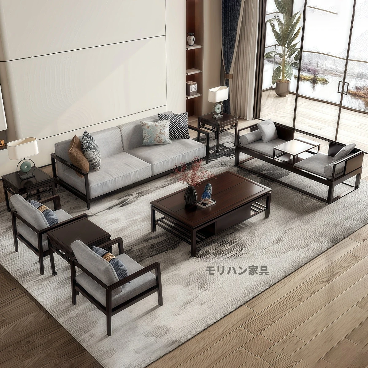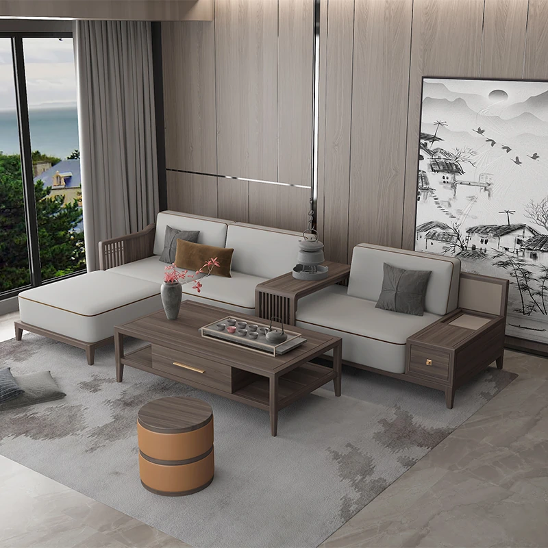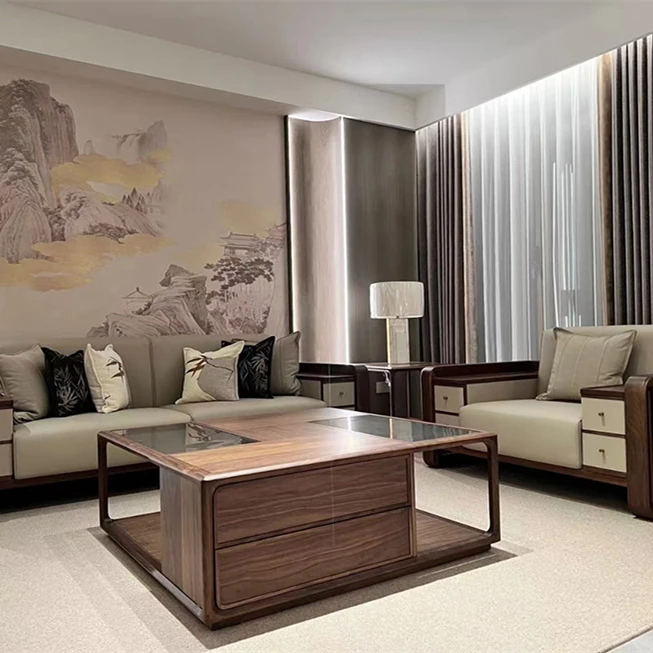 高級感あふれる新中式ソファとブラックウォールナット製のティーテーブルのセット!シンプルでモダンなデザインが魅力の別荘リビングやオフィスに最適な高級家具。スタイリッシュな空間を演出します!