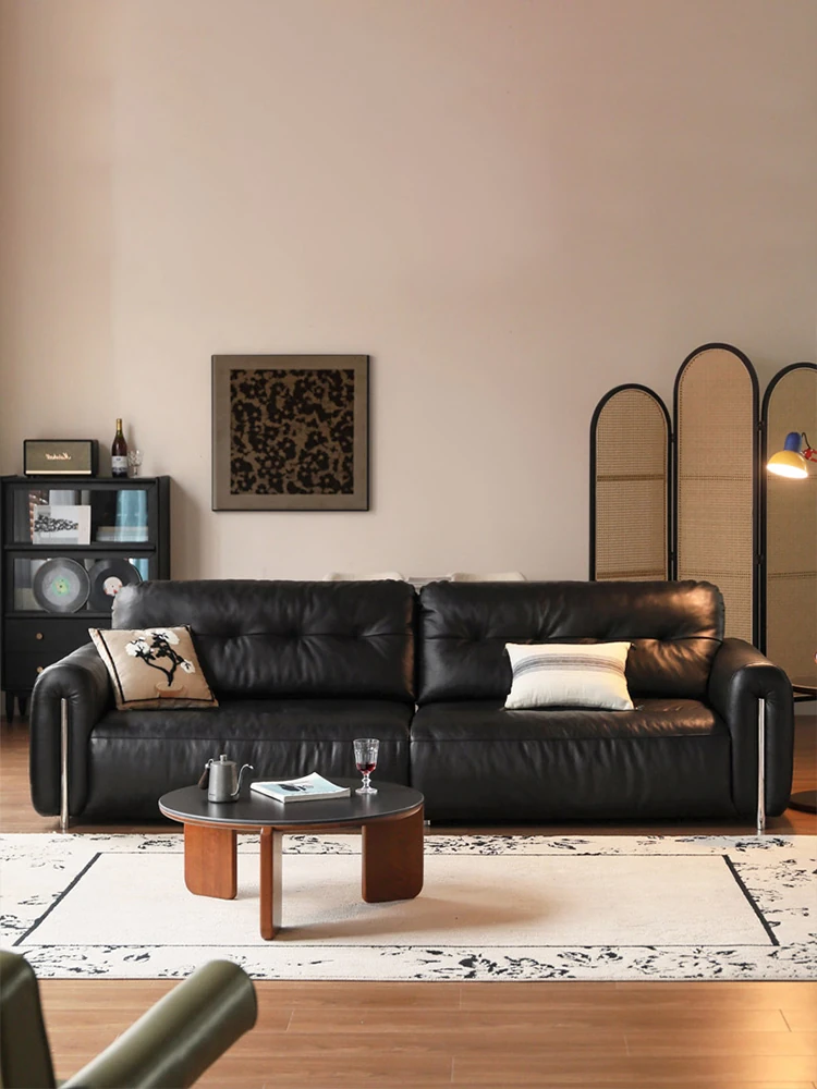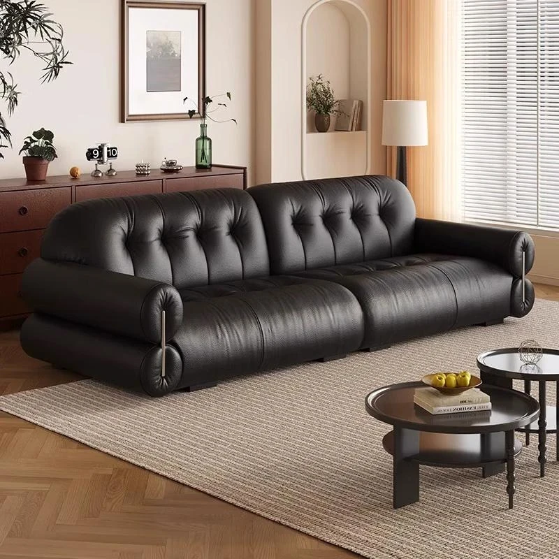 フィグ・レトロ・ビンテージ本革ソファ イタリアントップグレイン牛革直線型リビングルーム用ブラックバウハウス皮革ソファ - 高級感溢れるデザインで、くつろぎの空間を演出します!