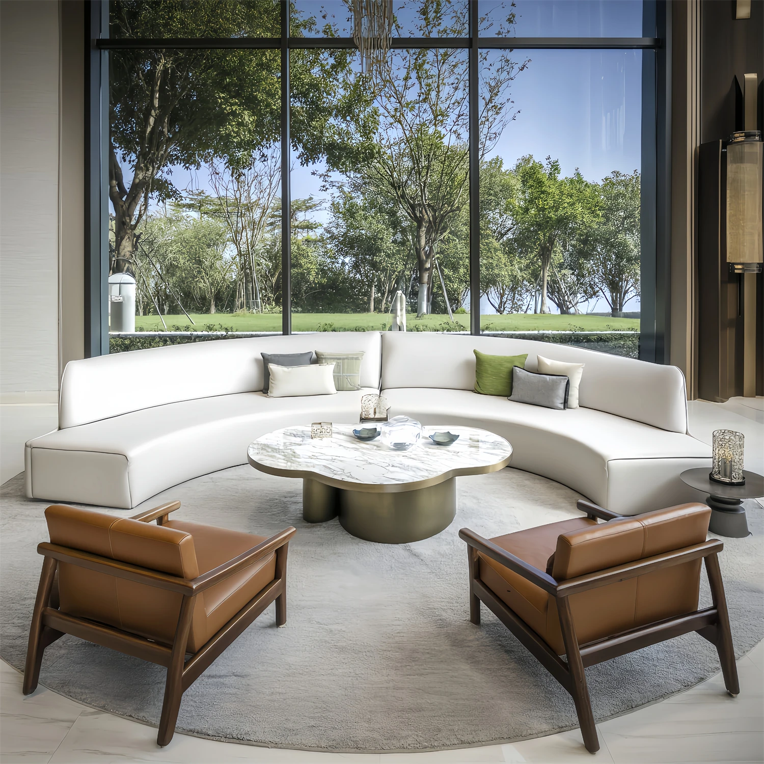 現代的高級展示場の休憩エリアに最適!洗練されたデザインのアーチ型ソファセット、売上所・ホテルロビー・会議にぴったりのクリエイティブな談話スペースを演出します。