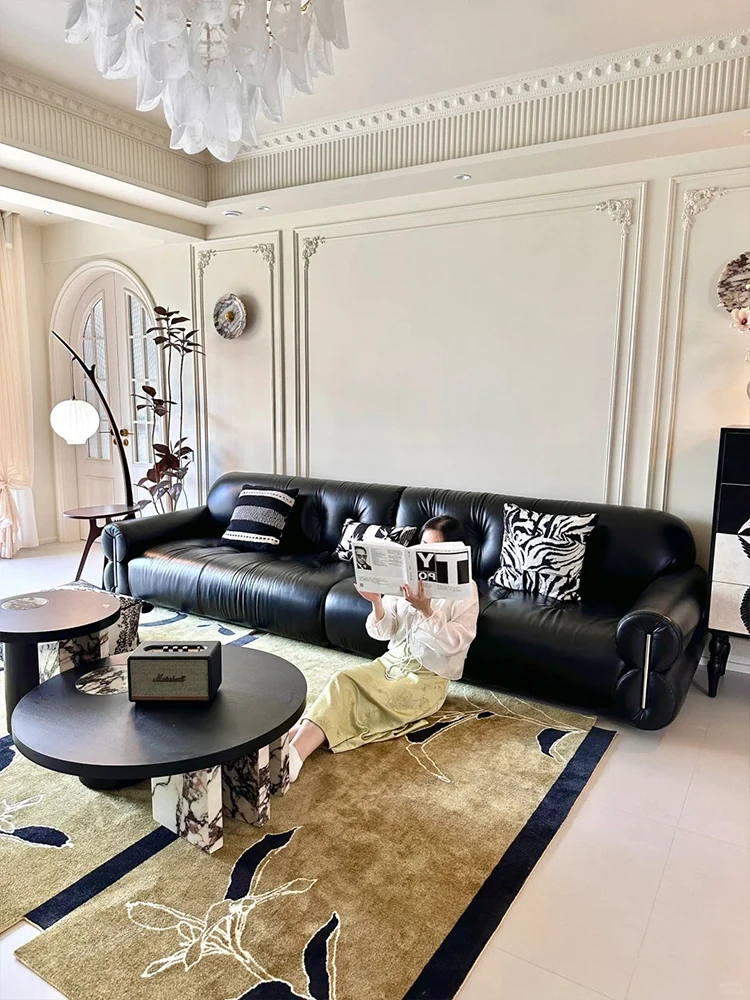 フェグ国補法式ヴィンテージ本革ソファ - 中華風ブラックトップグレインレザーリビングルーム用黒糖クラウドソファで、上質な風合いと贅沢な座り心地を実現。あなたのリビングにエレガンスと快適さをプラスします!